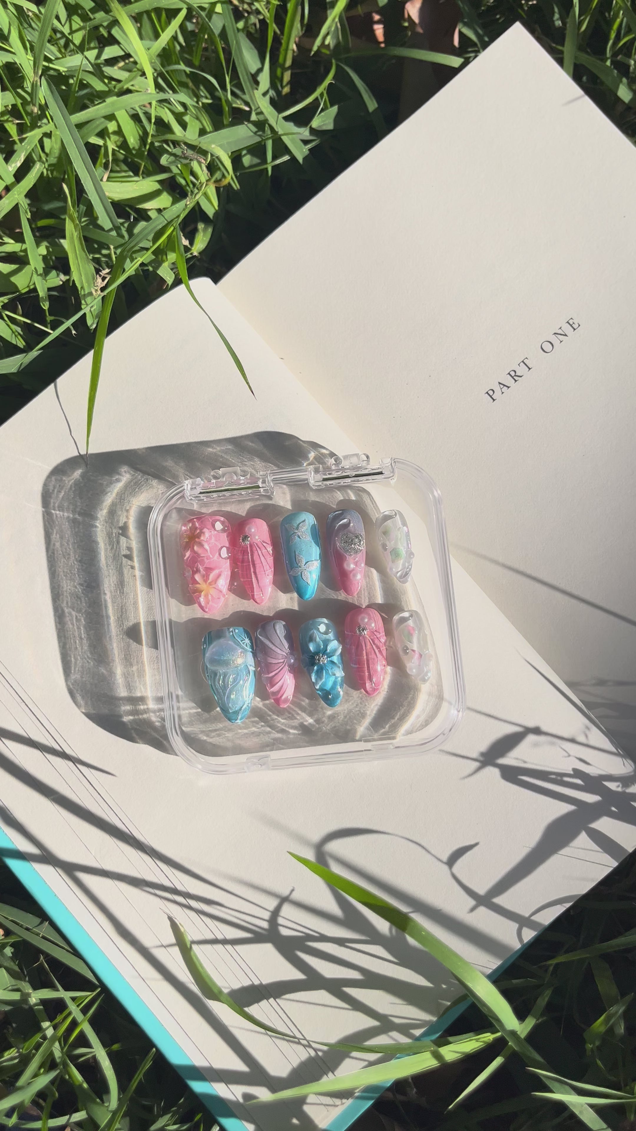 This set of press-on nails features a dreamy ocean-inspired design with pastel shades of pink, blue, and pearl white, decorated with delicate 3D details such as flowers, seashells, starfish, pearls, and even a jellyfish. Each nail has a unique, handcrafted look — from tropical plumeria blooms and seashell patterns to ombré waves and iridescent pearl finishes — all coated in a glossy top layer that mimics the shimmer of sunlight on water. The combination of soft colors, shimmering accents, and intricate 3D gel art creates a luxurious “Under the Sea” or “Mermaid Lagoon” vibe that feels elegant, playful, and perfect for summer, beach events, or anyone who loves feminine, ocean-themed nail art.