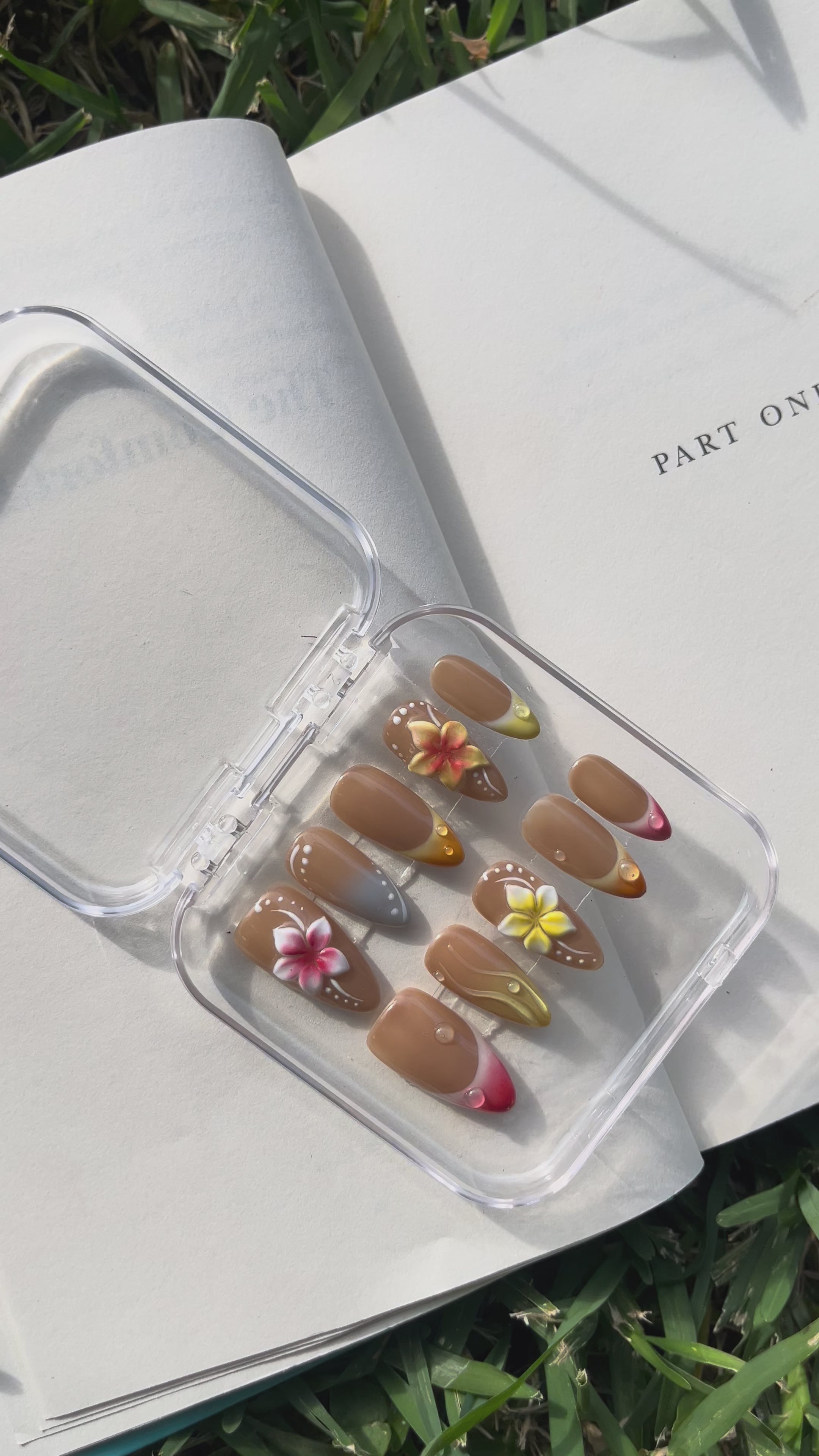 FloraLux Press-On Nails bloom with soft beauty, featuring a delicate mix of pink, nude, and sunny yellow tones accented with charming floral details. This design brings a fresh, feminine glow to your fingertips, blending playful colours with a luxurious, handcrafted finish. Each nail is shaped to flatter your natural nail bed and coated with a smooth, glossy shine for a polished, salon-quality look in minutes. Lightweight, reusable, and easy to apply, FloraLux is perfect for anyone who loves a cheerful, romantic style with a touch of elegance.